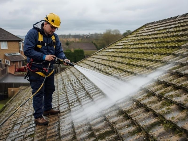 Pressure washing removes moss quickly but carries risks. High pressure jets can crack tiles, strip protective coatings from asphalt shingles, and force water under roofing materials where it causes leaks and moisture buildup.