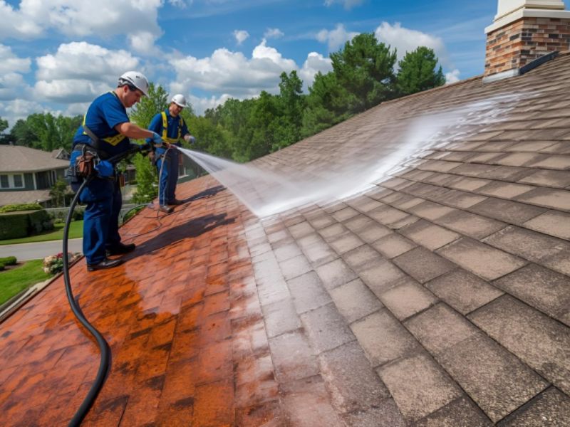 Professional roof cleaners start by inspecting your roof to identify problem areas and assess the roofing materials. This determines the right cleaning solution strength and application method.